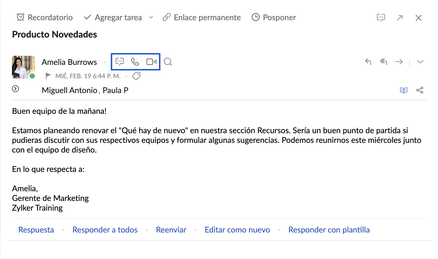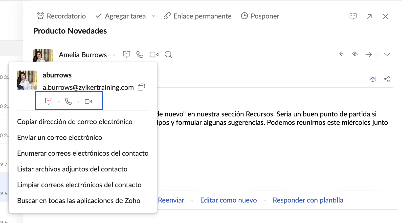 Opciones de chat y llamadas en correos electrónicos