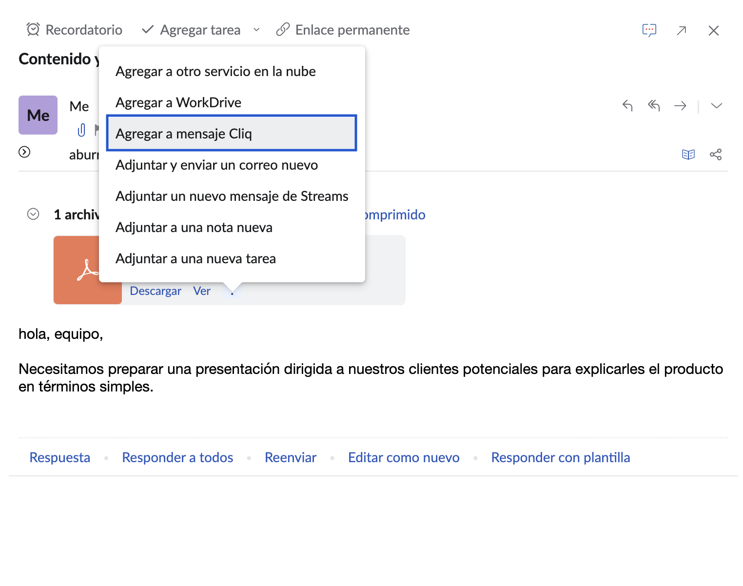 Puede arrastrar y soltar los archivos adjuntos de un correo electrónico a una ventana de Cliq abierta en Zoho Mail. También puede seleccionar y compartir varios archivos adjuntos de correo electrónico desde Zoho Mail a sus contactos, chats o canales de Zoho Cliq mediante la opción Agregar a mensaje de Cliq en el menú Más opciones.