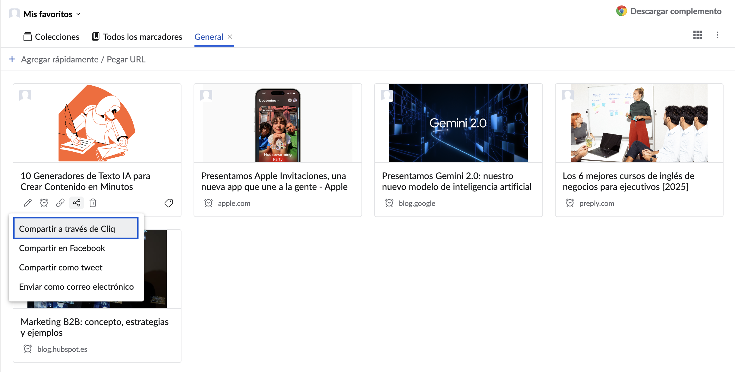 - Haga clic en el ícono de compartir y seleccione la opción Compartir a través de Cliq.