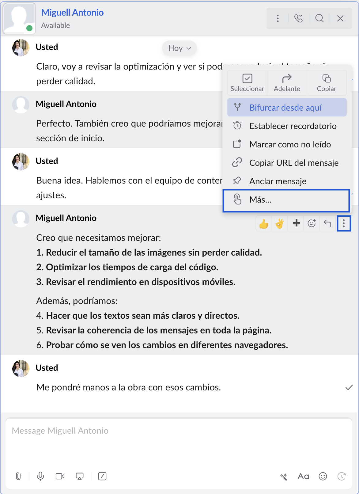 - Ubique el mensaje que desea agregar desde Zoho Cliq y haga clic en el menú de mensajes.