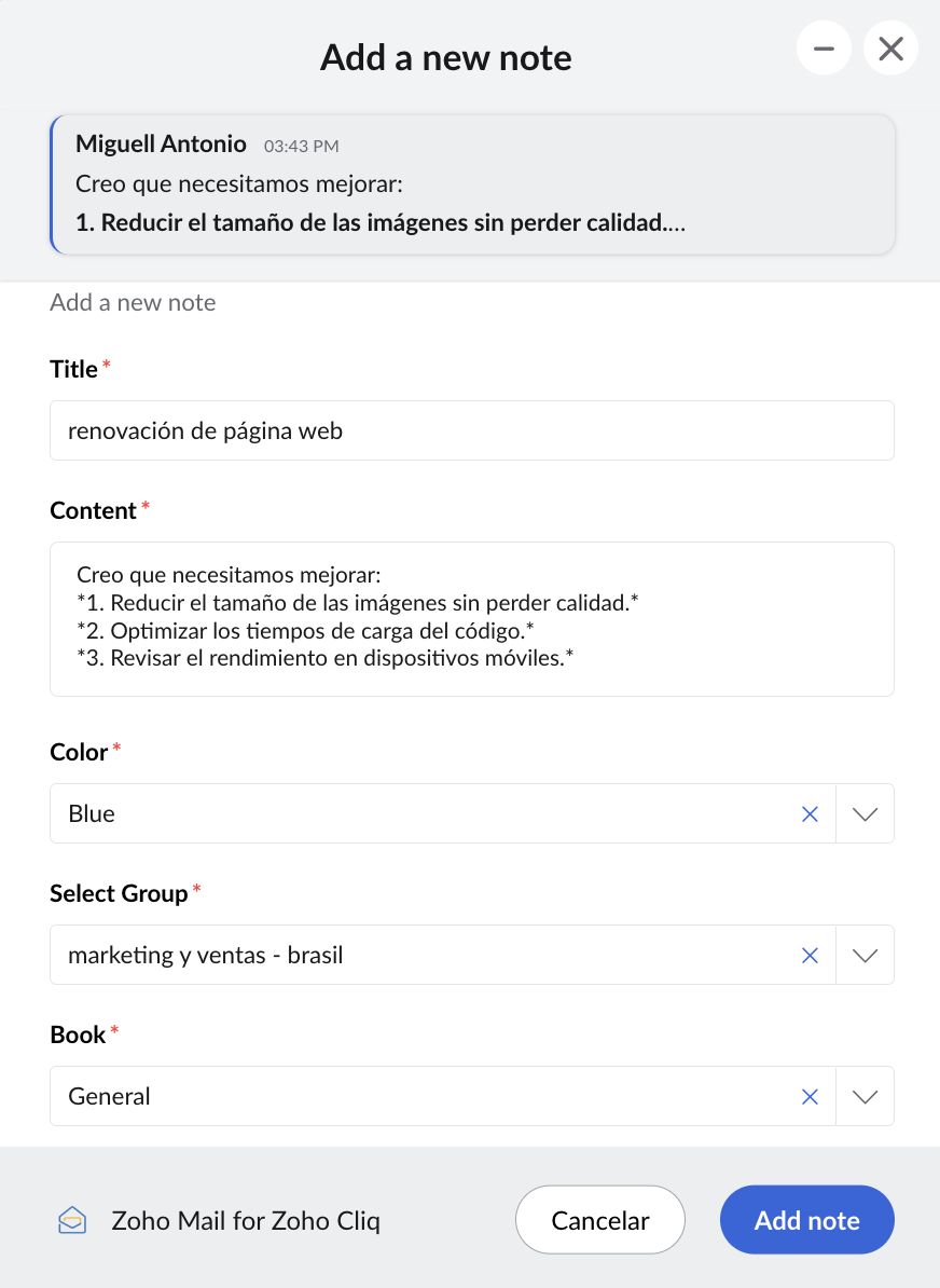 Puede agregar un mensaje de Cliq como nota, tarea, publicación de Streams o enlace de marcadores en Zoho Mail.