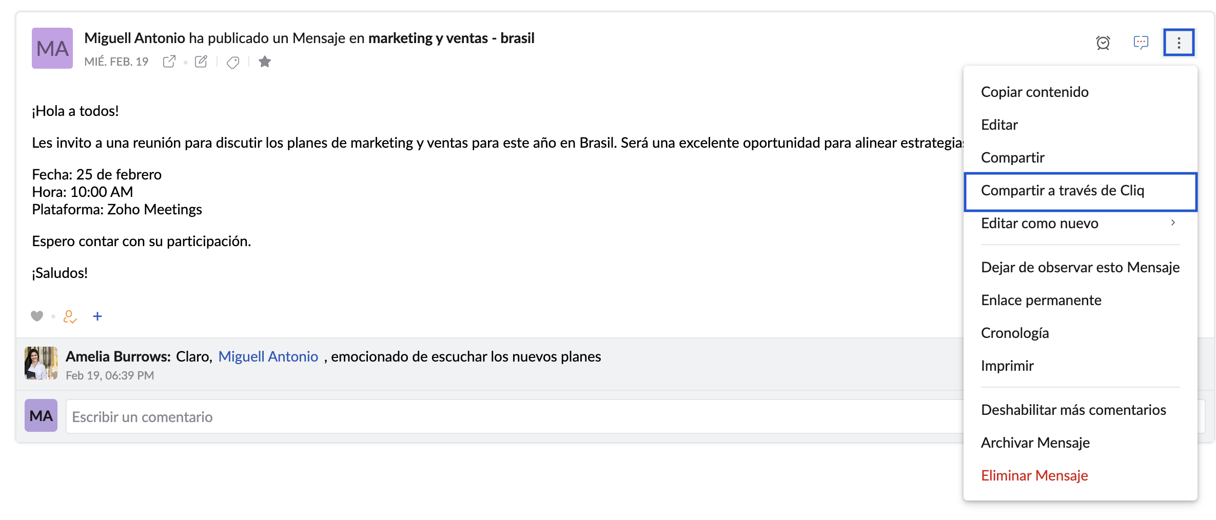 Puede compartir el enlace permanente de una publicación de Streams como mensaje en Zoho Cliq mediante la opción Compartir a través de Cliq en el menú Más opciones de una publicación.