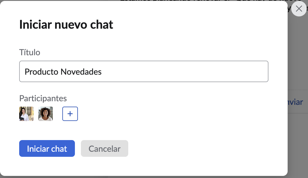 La opción Chatlet le permite iniciar un chat con los participantes de cualquier correo electrónico o publicación de Streams. Para abrir una sesión de chat desde un correo electrónico, haga clic en el ícono de chatear sobre este correo electrónico que aparece en el encabezado del correo electrónico. Una vez que haga clic en el ícono, aparece la ventana emergente Iniciar chat con el título del chat y los participantes. Puede editar el título y eliminar o agregar los participantes según sus necesidades.