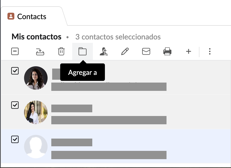 Los contactos se pueden agregar a las categorías si los arrastra y suelta en la categoría deseada. Puede agregar varios contactos a la vez a una categoría seleccionando los contactos pertinentes y haciendo clic en el ícono Agregar a.