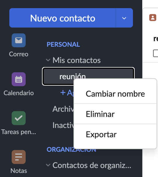 Puede hacer clic con el botón secundario en una categoría en vista personal para cambiar el nombre, eliminar o exportar un contacto. Puede hacer clic con el botón derecho y utilizar la opción Exportar para exportar solo los contactos de esa categoría. Puede proteger su exportación con una contraseña. También puede exportar contactos desde una organización o grupo de organización del que forma parte.
