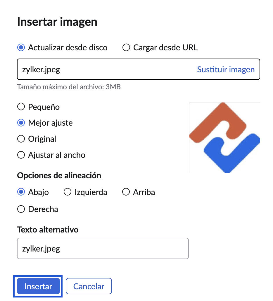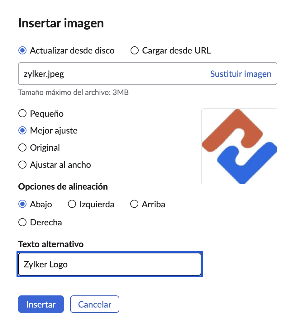 - Tamaño de la imagen: puede elegir que sea pequeña, que tenga el mejor ajuste o el tamaño original después de insertar la imagen.