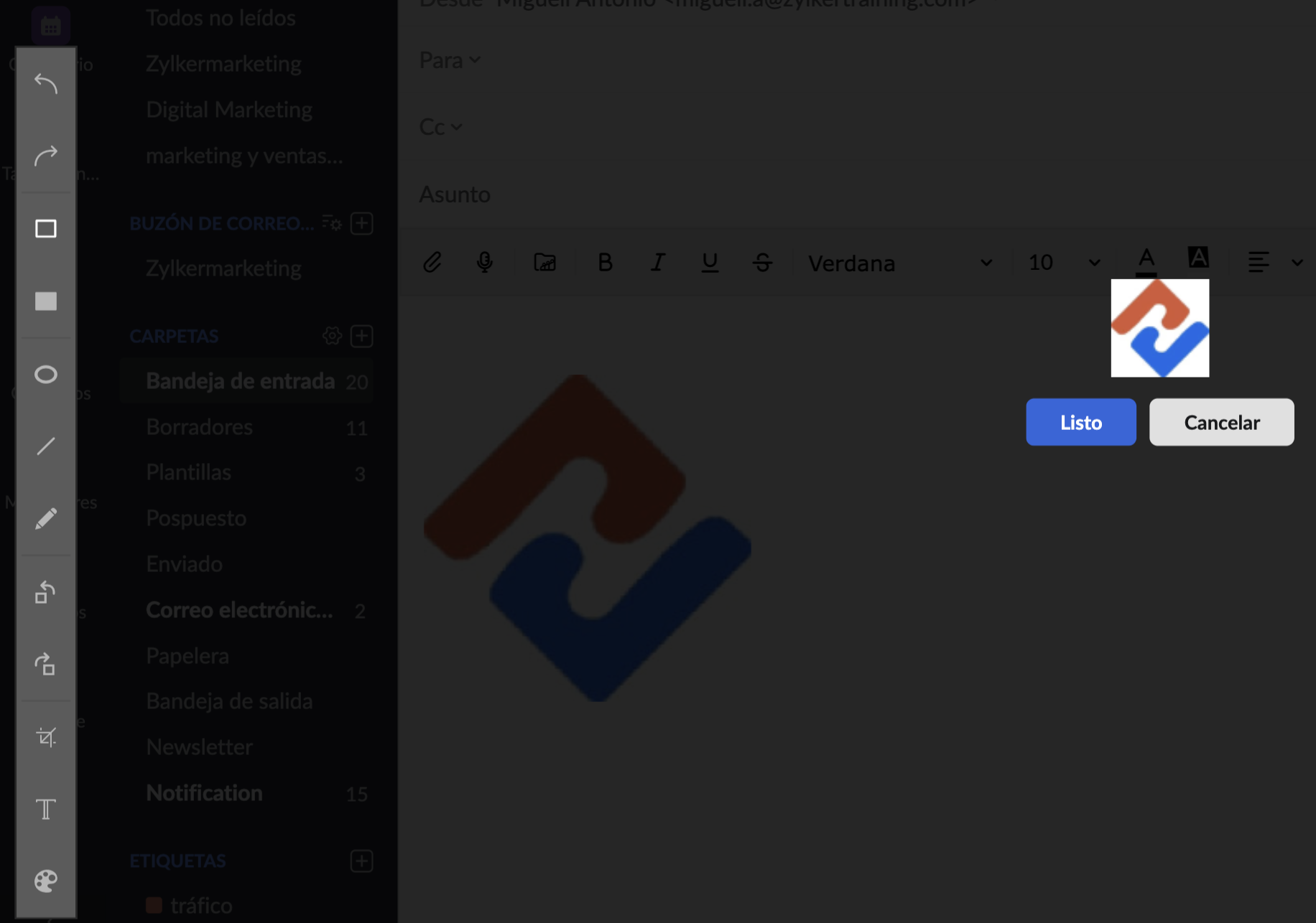 Puede insertar imágenes en el contenido del correo electrónico o incrustar imágenes en su firma utilizando el ícono Insertar imagen.