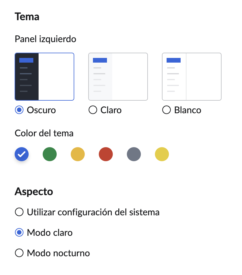 También puede utilizar el interruptor Modo nocturno en el panel derecho para elegir la configuración de apariencia.
