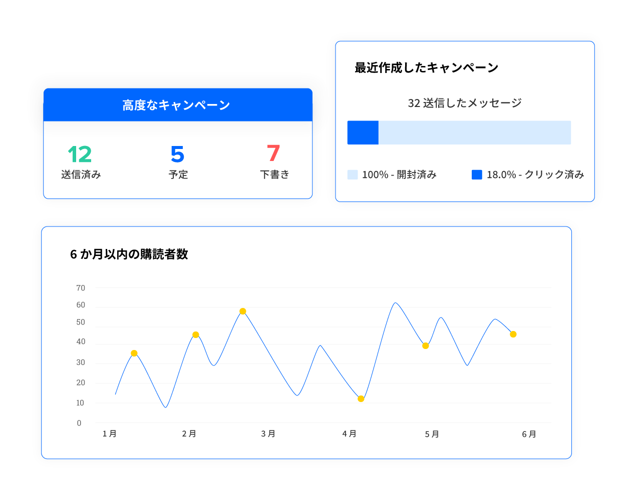 メールや、SNS、アンケート、など各媒体での活動を、作成から実行まで行えるツールを備えています。