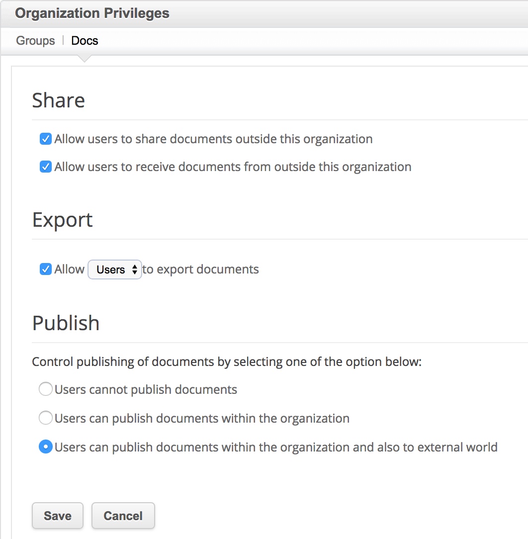 この権限はコントロールパネルから制限できます。ドキュメントの公開を完全に禁止すること、組織内で制限すること、組織外のユーザーに許可できます。