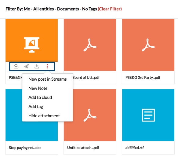さらに、添付ファイルのダウンロード、ストリーム投稿またはメモへの添付ファイルの追加、添付ファイルの非表示や印刷、添付ファイルのクラウドへの追加を行うオプションがあります。
