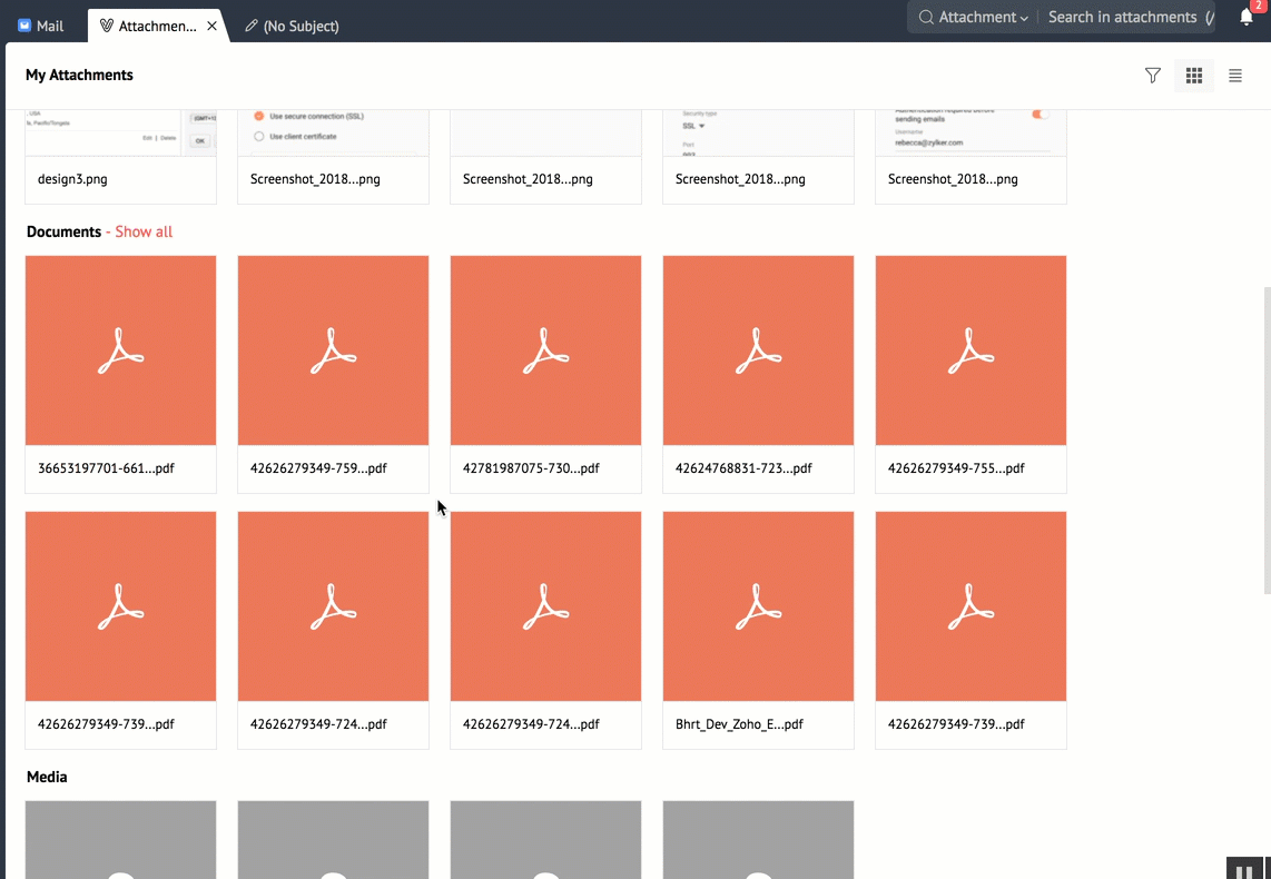 添付ファイルのビューアーでは、受信したすべての添付ファイルを1つの場所でまとめて表示できます。添付ファイルのビューアーは、、多数のメールと転送によって乱雑に並んだ添付ファイルの問題を主に解決します。