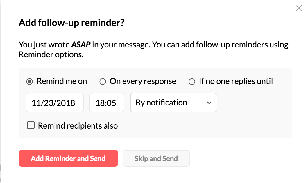 - 返信の有無に関係なく通知 - 返信の有無にかかわらず、設定した時間に、メールについての通知を受け取れます(例:立ち上げに出席する予定があり、その出張に同行したいかどうかを友人達に尋ねたとします。返信の有無にかかわらず、メールについてのリマインダー通知を受け取り、出張の計画やチケット予約を行う必要があります)。