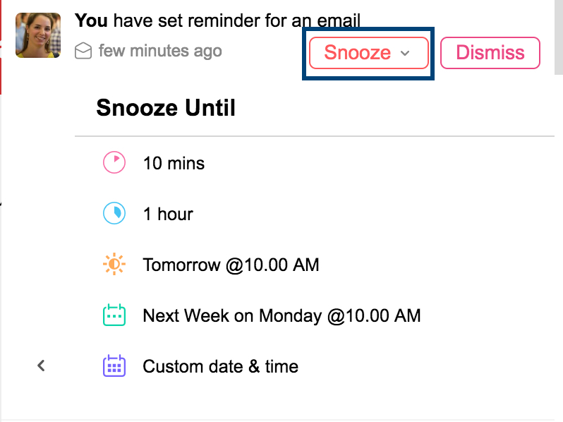- 返信ごとに通知 - メールへの返信を受信するたびに、通知されます (例:新しい製品またはアプリについて、多くの見込み客にメールを送信するとします。返信があるたびに、リマインダー通知を受け取ることができます)。