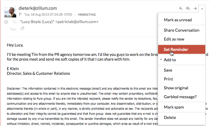 Zoho Mailのリマインダー通知オプションを使用して、メールにリマインダー通知を追加できます。メールを作成したらそのメールを監視し、選択したオプションに基づいて、後でリマインダー通知を受け取ることが可能です。リマインダー通知を使用して、メールに基づく作業項目を簡単に追跡できます。また、受信したメールにもリマインダー通知を追加できます。