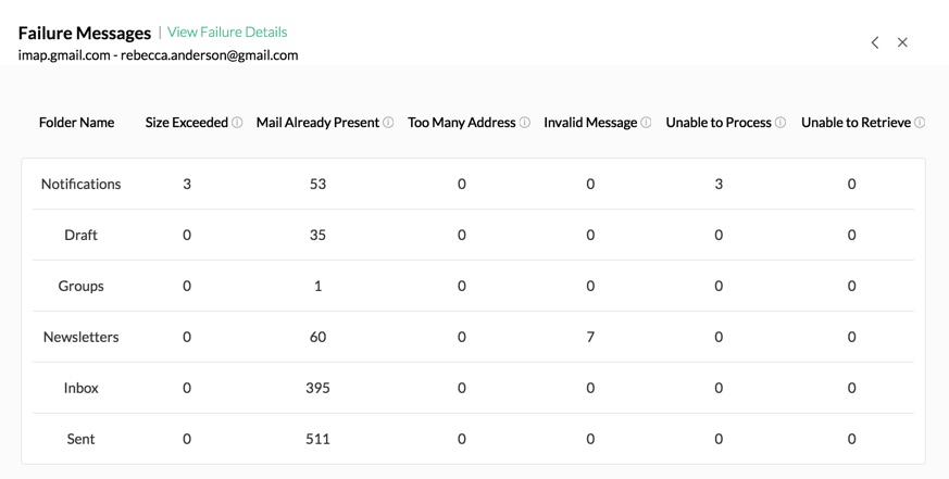 - 失敗の詳細(メールをZoho Mailアカウントにインポートできなかった、など)については、[失敗の詳細を表示]オプションをクリックして表示できます。