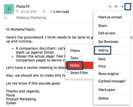 Zoho Mailでは、メールに対応するメモを追加できます。追加したいその他の情報とともに、メール全体をメモとして追加できます。