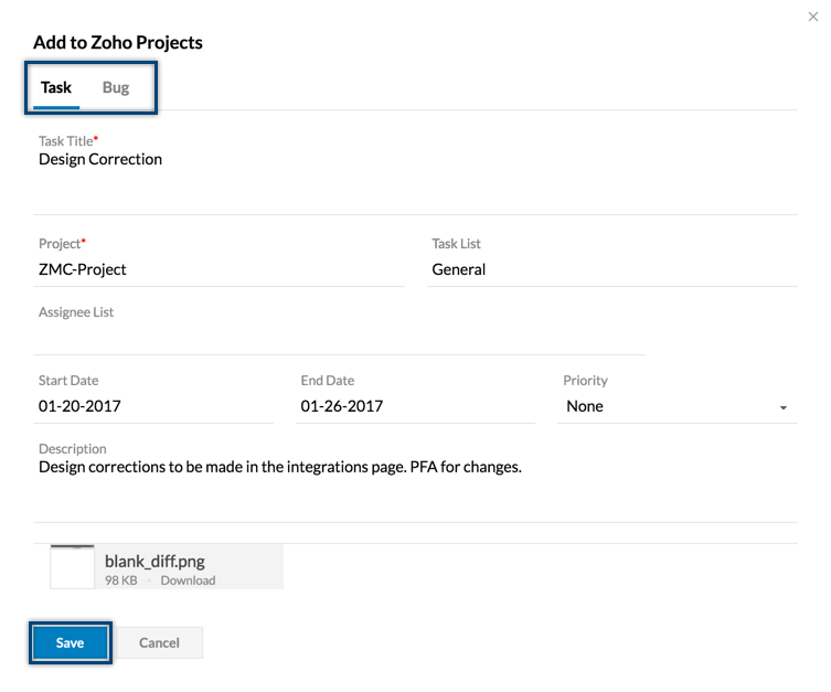タスクアプリケーションからのZoho Projectsタスクの表示/アクセス