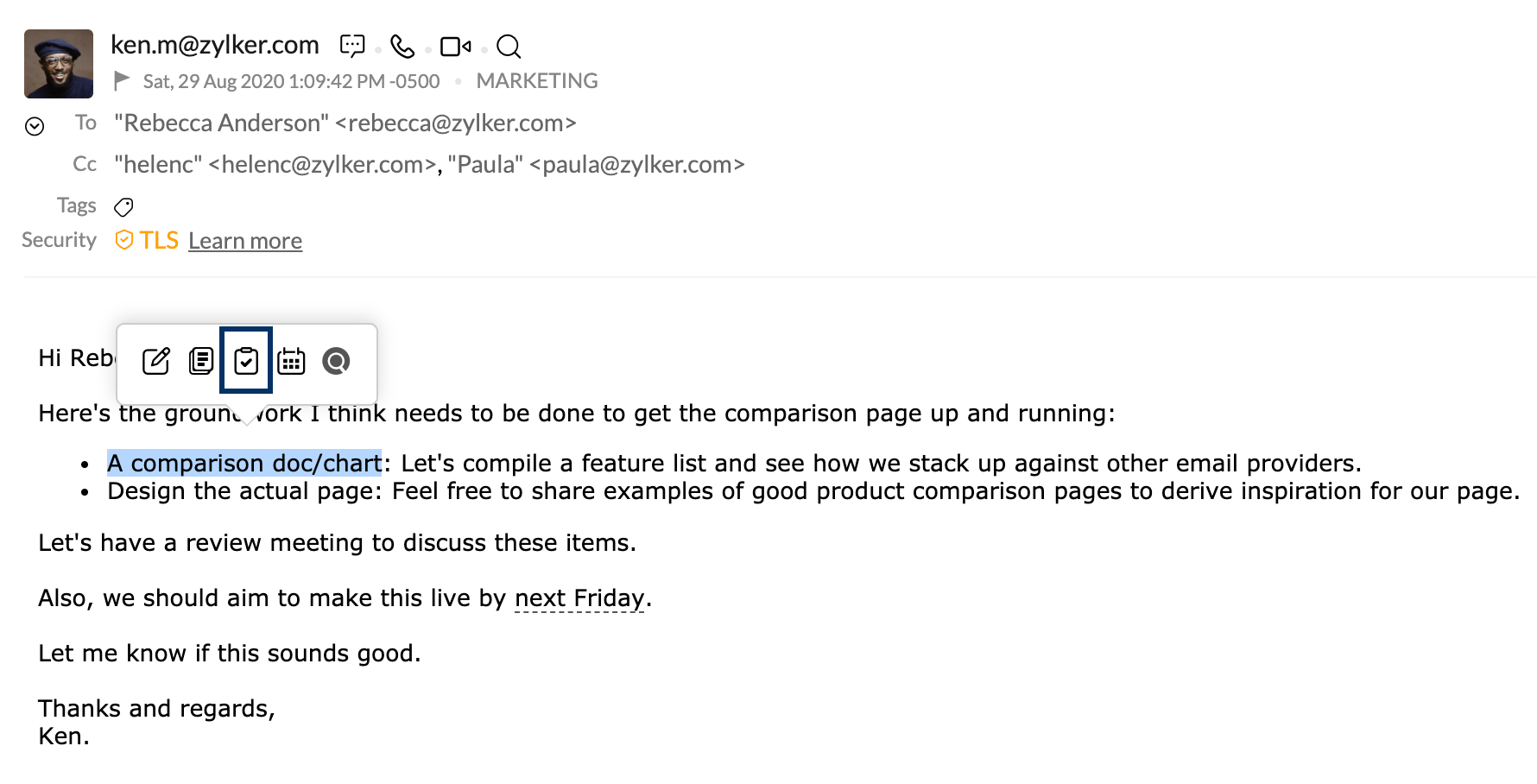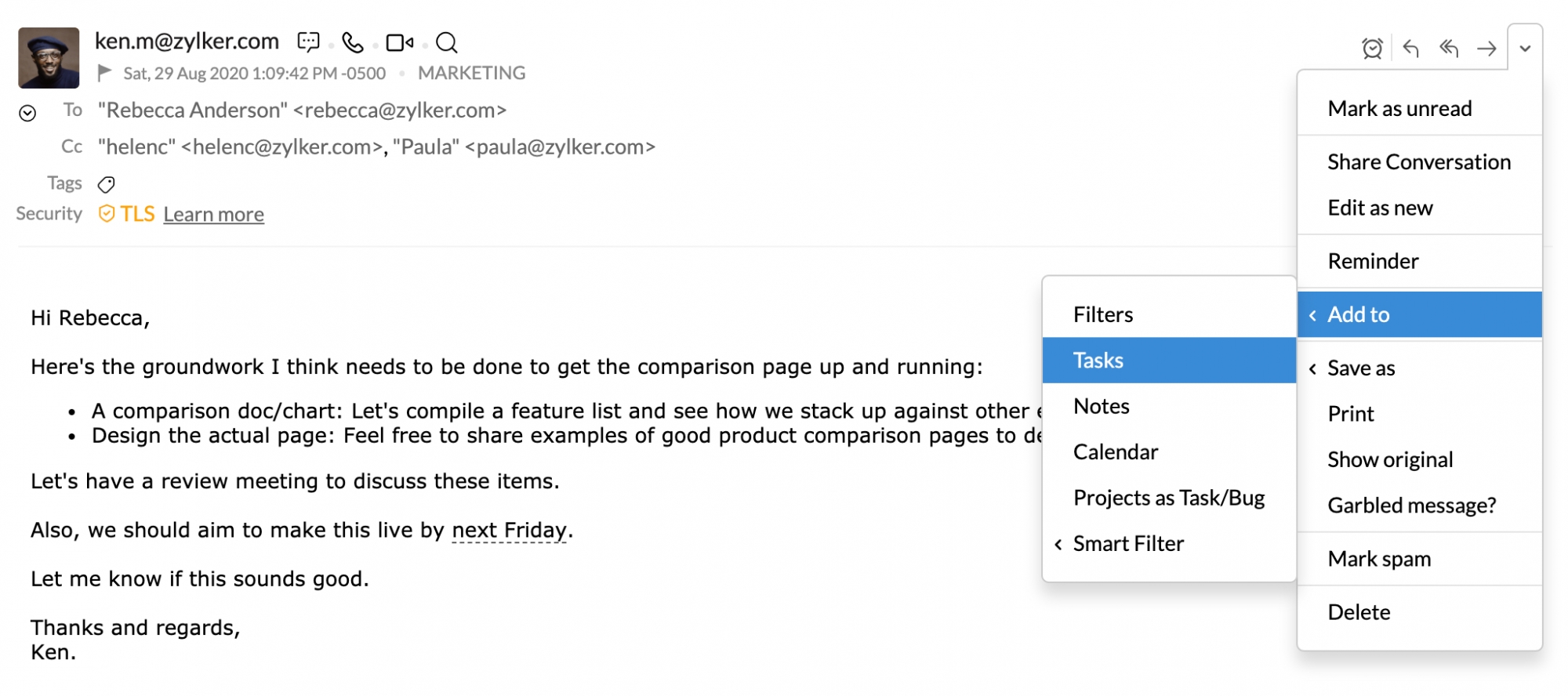 | <username>+task@domainname.com | rebecca+task@zylker.com | Creates a Personal task. |