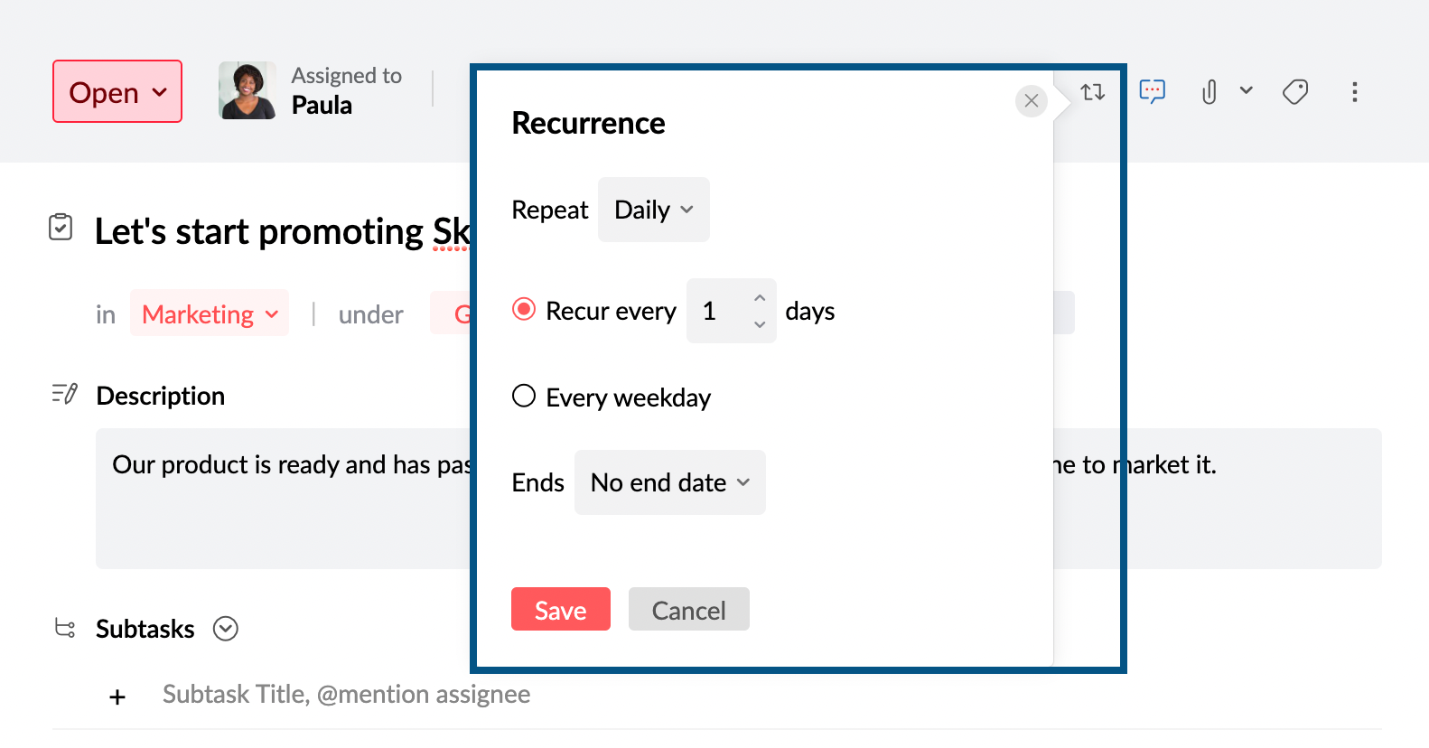 - In the Subtasks section, mention the task name and the assignee. Hit the enter key to save the Subtask. You can add as many subtasks as you want and assign anyone from the organization for the same.