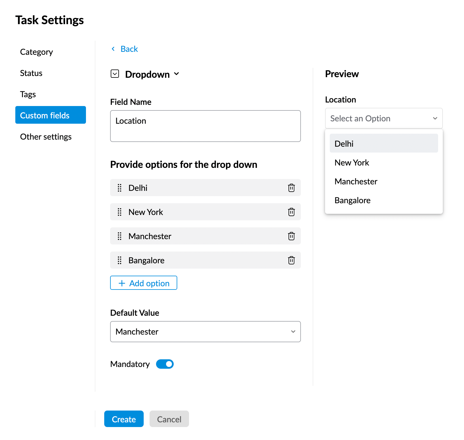 - You can make the Custom field mandatory for the users to fill during task creation by enabling the Mandatory toggle.