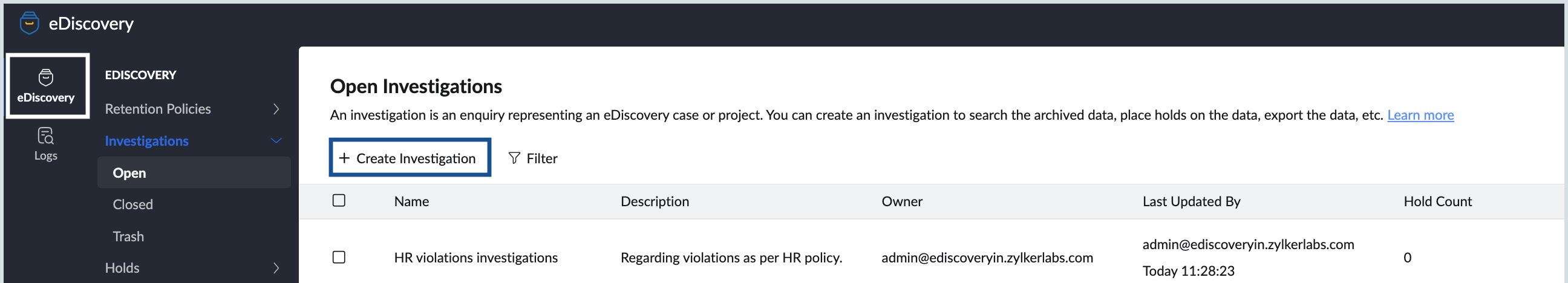 All the actions of the administrators in this portal will be recorded in the logs section. Instead of viewing the activity specific to an investigation, you can view all the activity in the eDiscovery portal here. Navigate to the corresponding help sections to learn more: