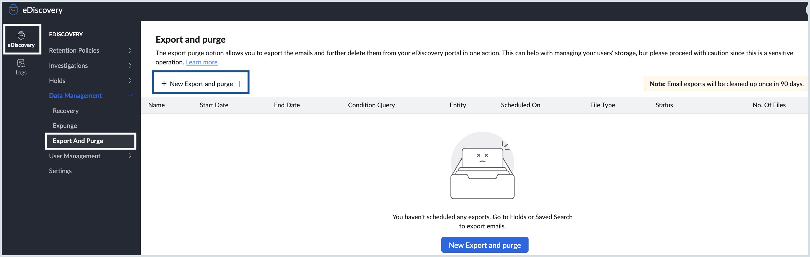 The export and purge action can be used to manage the eDiscovery storage of users. If a user's storage nears the maximum limit, you can either purchase additional storage or export and purge old emails to free-up storage space. Navigate to the Manage eDiscovery Storage section to create a new export and purge.