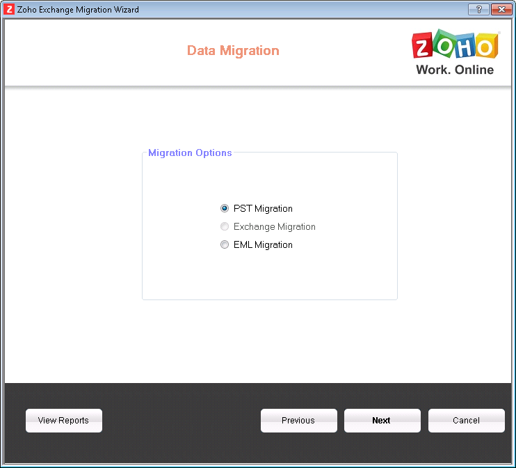 - Launch the Wizard using the desktop shortcut or execute the file 'ZohoMigrationWizard.exe' from \Zoho\Zoho Exchange Migration\bin folder, under the installation path.