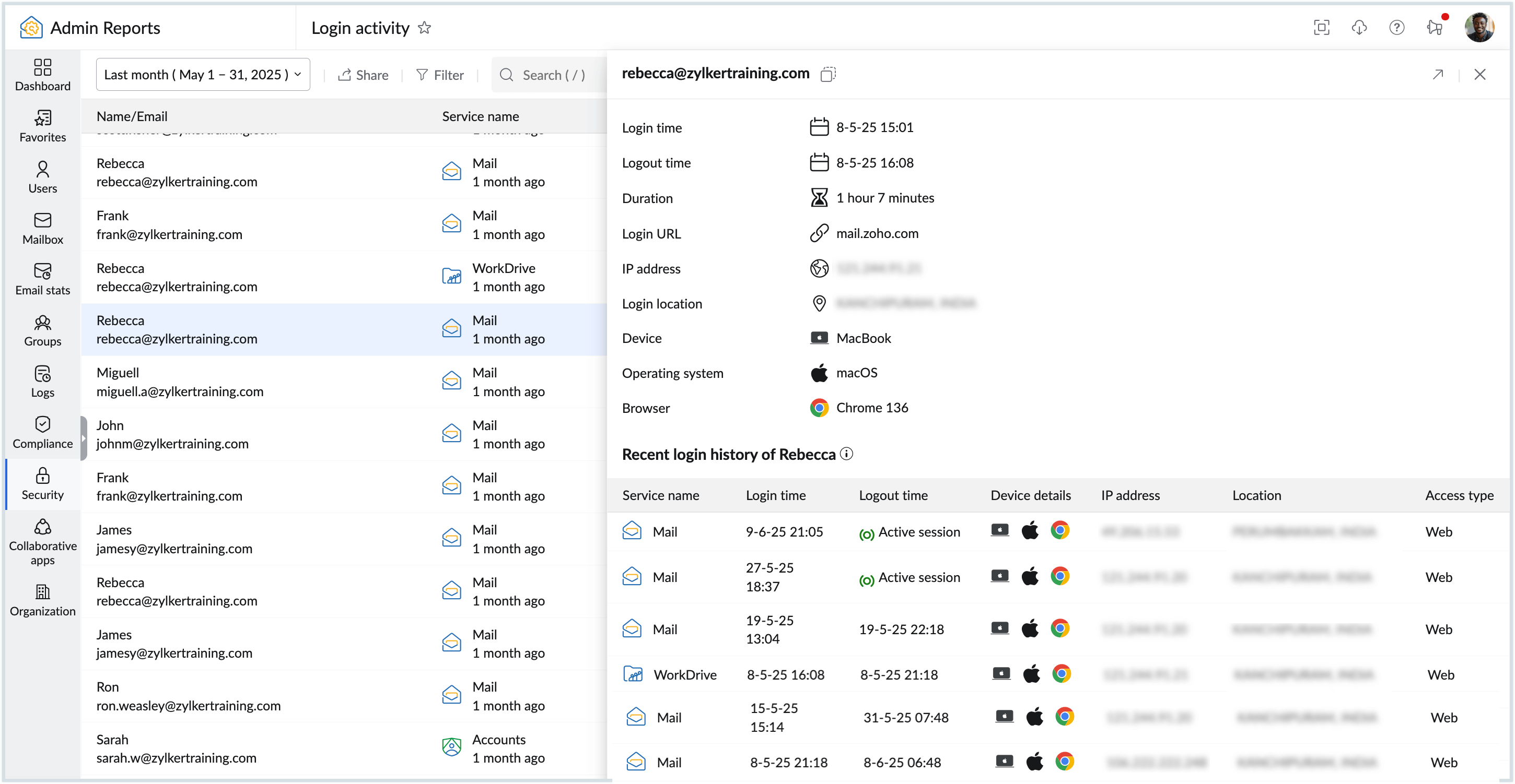 Based on a user's previous login behaviour, Zoho Mail alerts if there is any suspicious login activity. Administrators can view the list of suspicious login activities based on the selected duration. To view the suspicious logins, follow these steps: