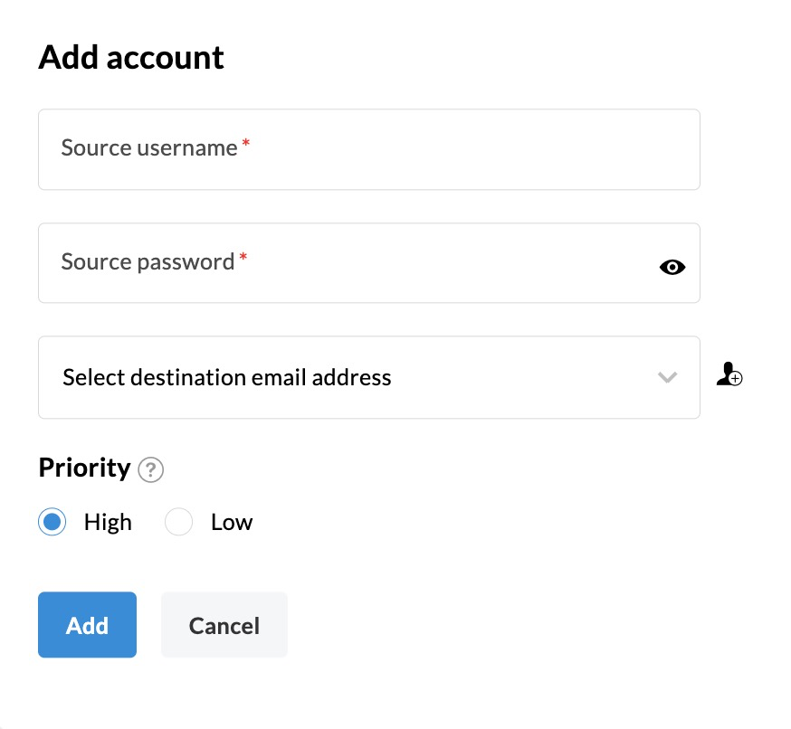 - Enter the Source user name, Source password and Select the destination email address.