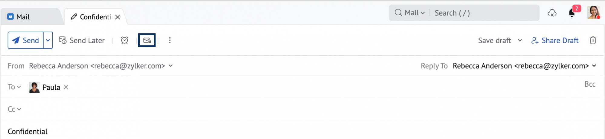 - In the Compose window, click on the Secure Email icon from the top menu.