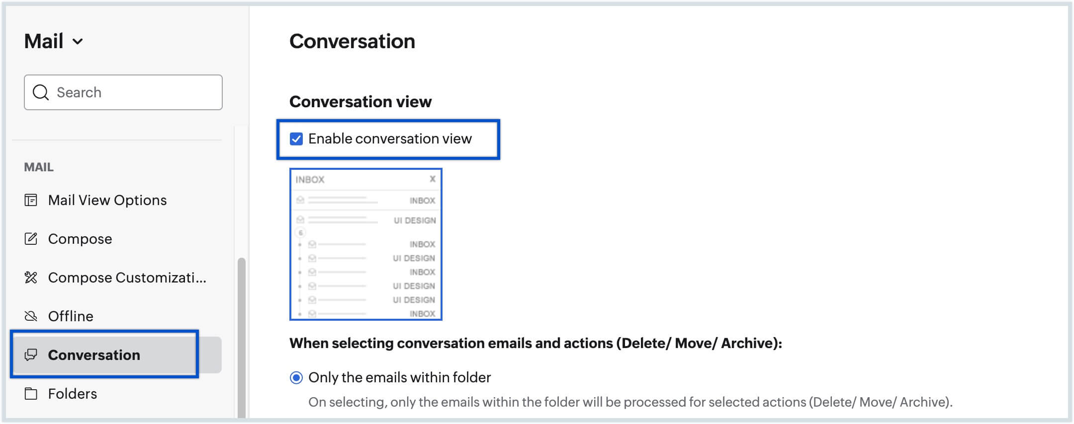 When you perform bulk email actions like Delete emails, moving to folder etc, in conversation across folders, all the emails listed in the tree will be moved or deleted by default. If you want better control, you can define which emails must be affected for the performed bulk action. This will ensure that any such selection and act will affect only the email in the same folder and not all the emails across all the folders. Choose your preferred Bulk action behaviour from the list: