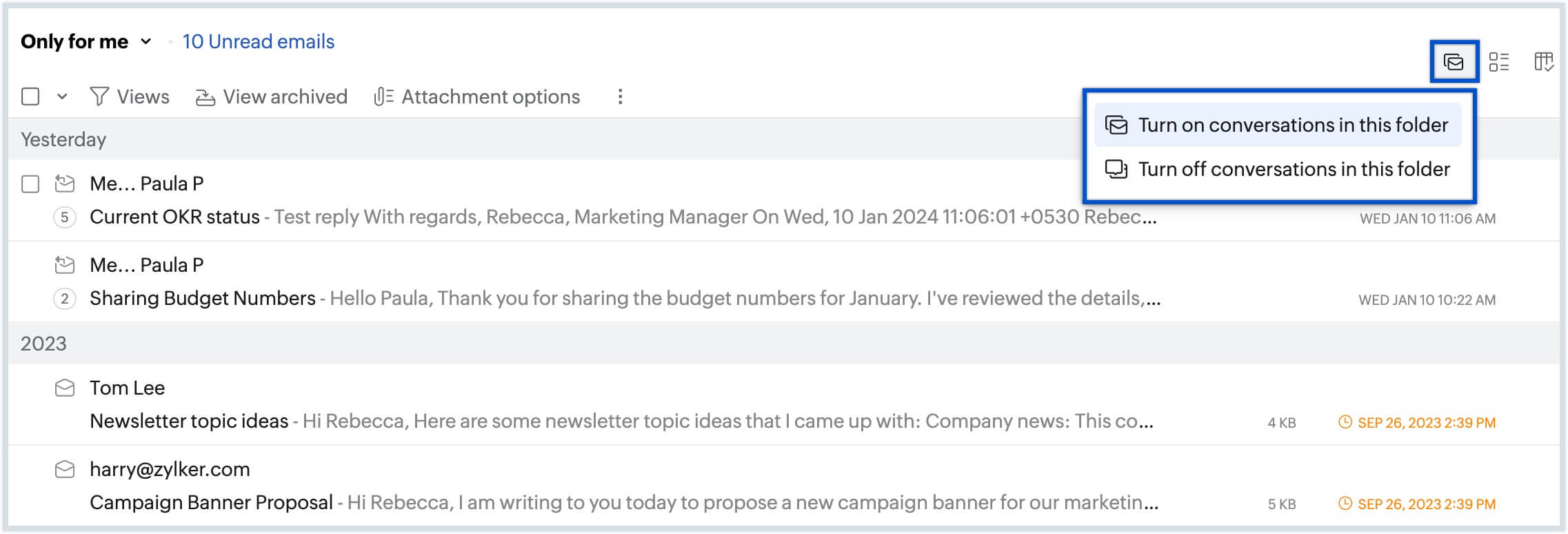 - Click the Conversation icon on the top right corner of the screen, to turn ON/OFF conversation view for the current folder.