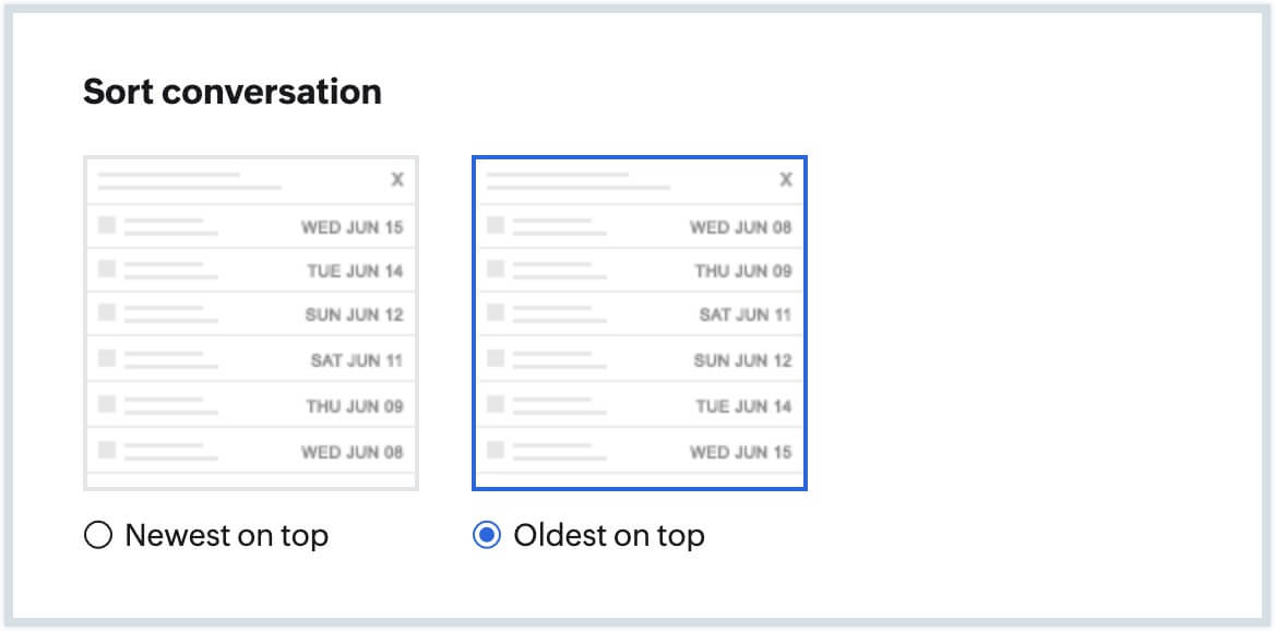 Click Settings, choose Conversation. Under Sort Conversations, the following options are available to choose between - Latest on top, Oldest on top.