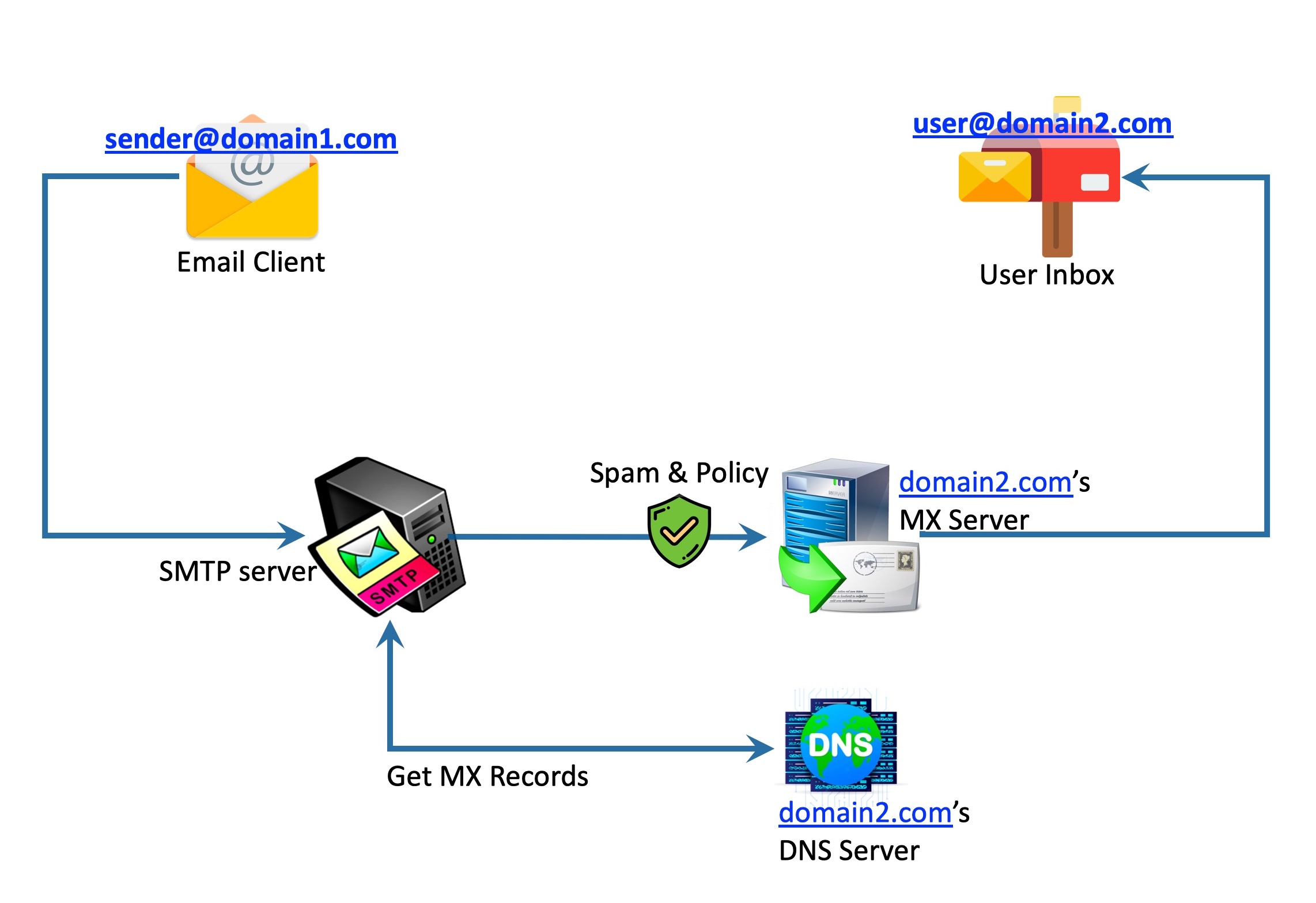 - The SMTP server looks up the DNS records of the domain and retrieves the MX records information of the recipient servers (A Records in case no MX record is found).
