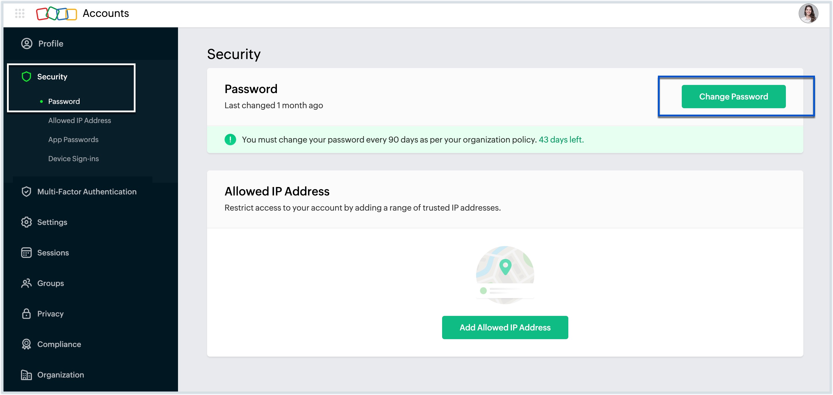 - You will be taken to the Zoho Accounts page. Navigate to Security in the left pane.