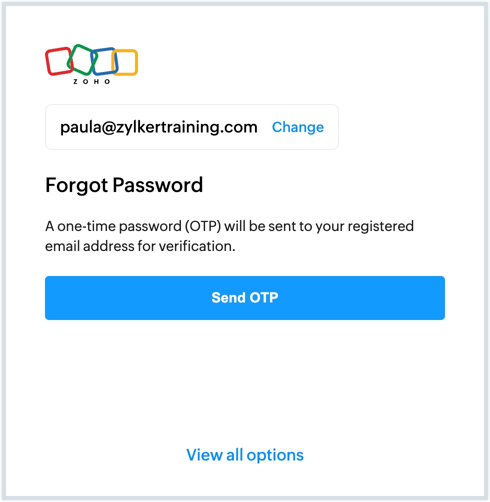 - Click Send OTP to send a verification code to your registered email address, or select View all options to choose the password reset method of your choice, i.e., if you want a reset link emailed or a verification code sent to your mobile number.