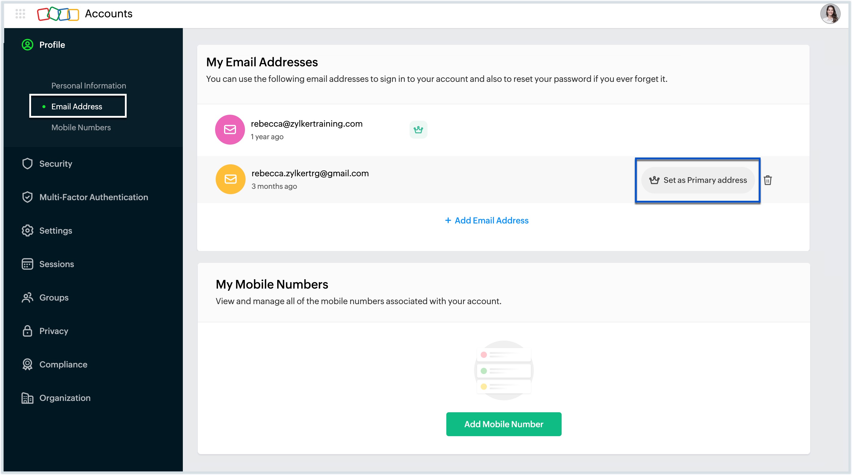 - You will be redirected to the Zoho Accounts page. On the left pane, navigate to Profile and select Email Address.
