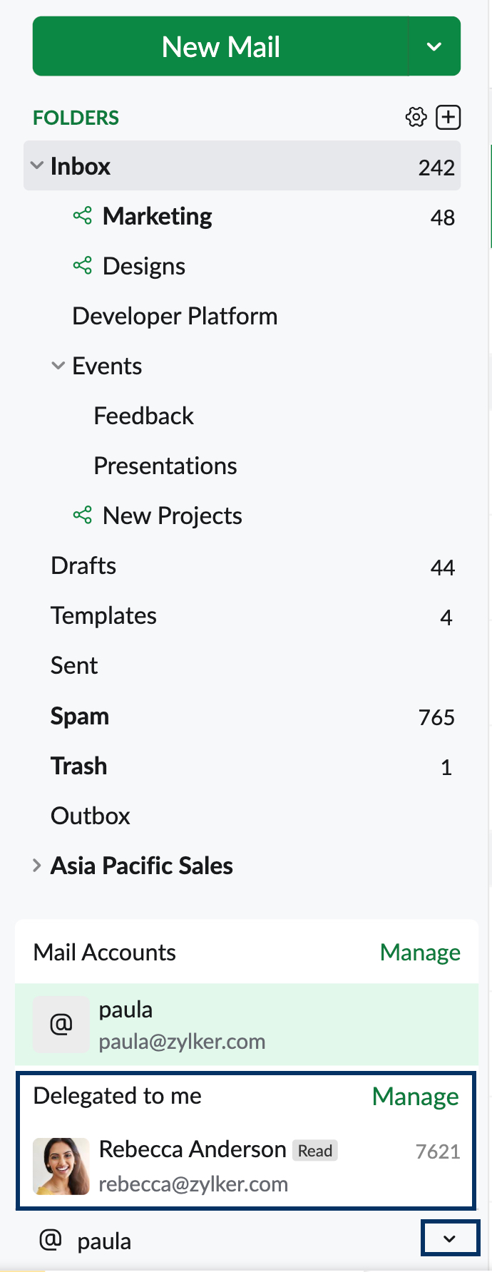 The delegates provided with Read access can only view the emails in the delegated mailbox. To access the emails in a delegated mailbox, login to Zoho Mail and click on the Account switcher at the bottom of the left pane. Click on the delegated account in which you want to view the emails under the Delegated to me section. You can view the emails under the Folders, Tags, and Views section of the delegated mailbox.