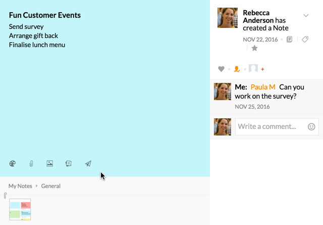 On opening a particular note, options for commenting on the note, adding invitees etc. can be viewed.