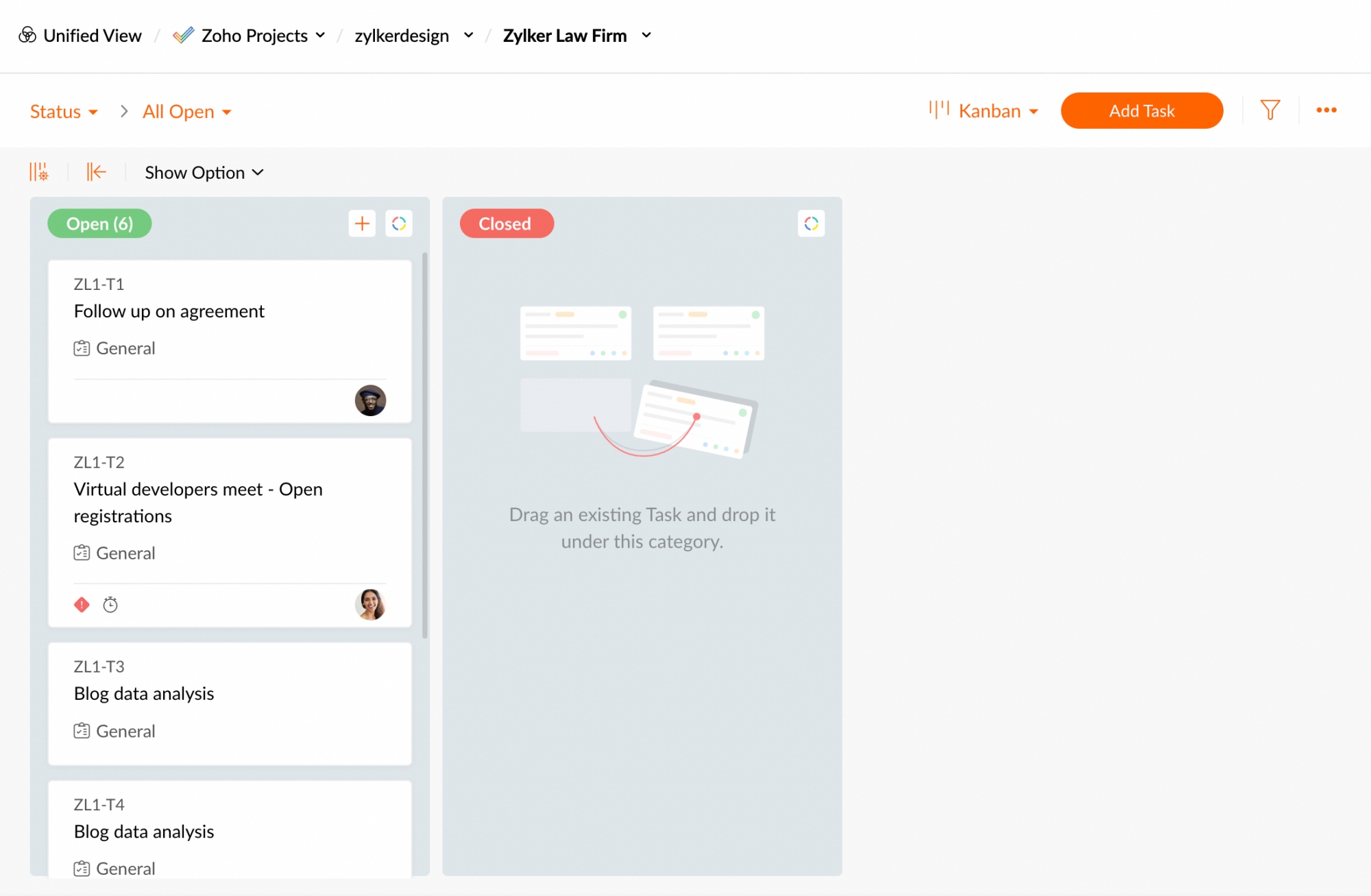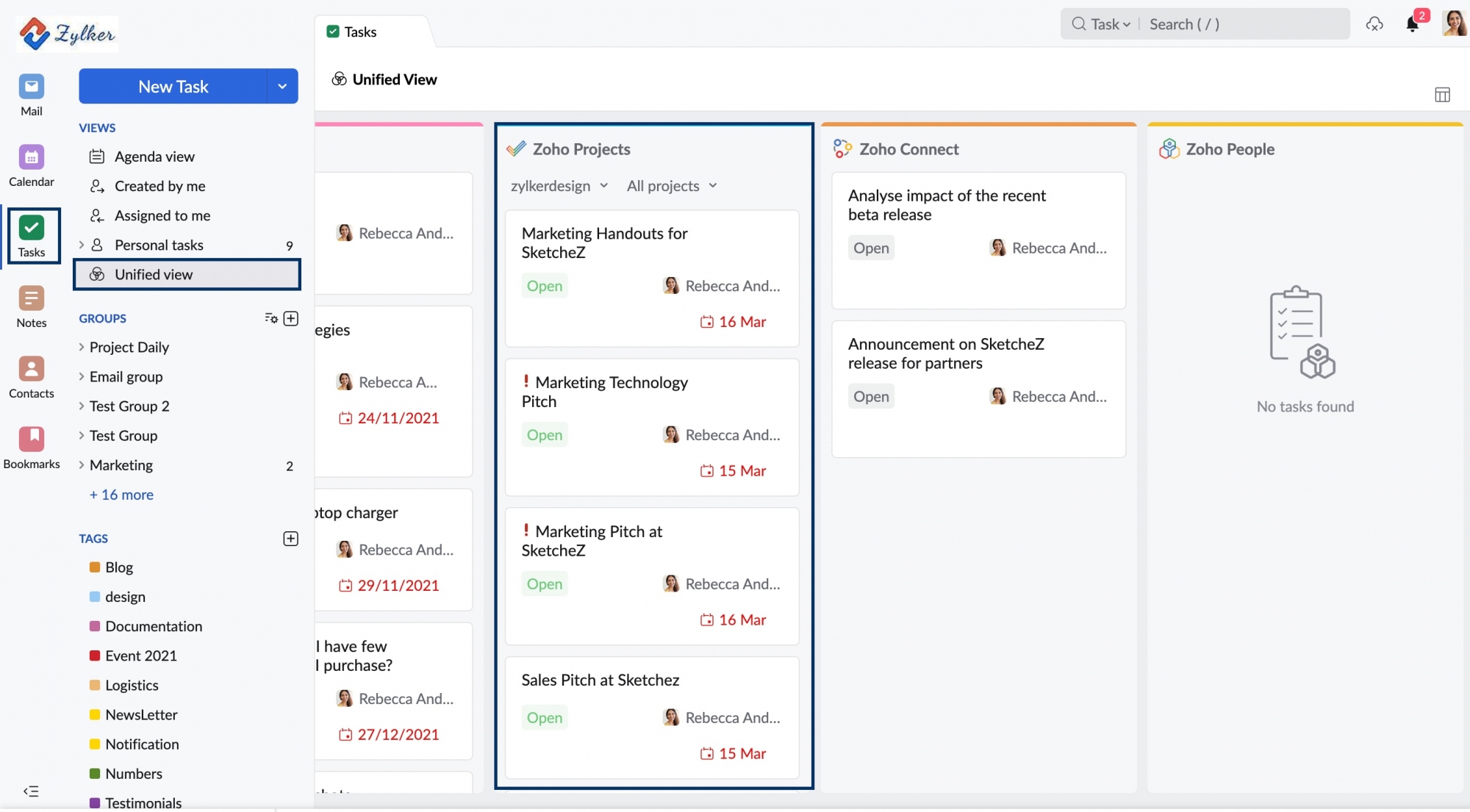 - Click on Unified View to access tasks from all Zoho applications in a single location.