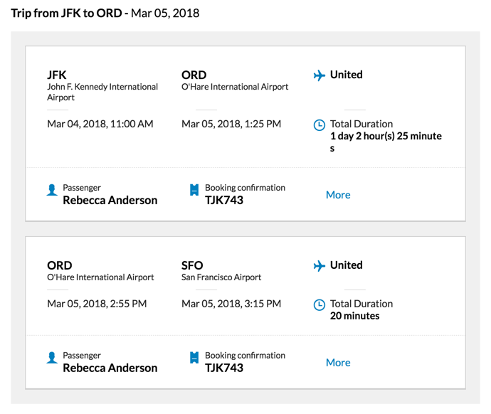 When a reservation is made for a trip, the vital details in the email, such as the boarding and destiation airports, the confirmation number, the date of journey etc. will be displayed to the users in a card format.