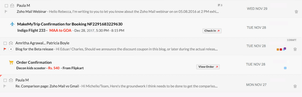 For example, in a flight ticket confirmation email, parts of the email such as the flight number, date and time of departure, the boarding and destination points are vital information. It would be simpler for a user to view these snippets in the email listing, rather than to open the email and view the flight details.