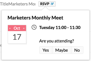 You can respond to event invites that you receive using the RSVP action icon. You can click this icon and directly respond to the invite depending upon your interest. The card that pops up on clicking this icon will display the date, time, venue and the person who has invited you.