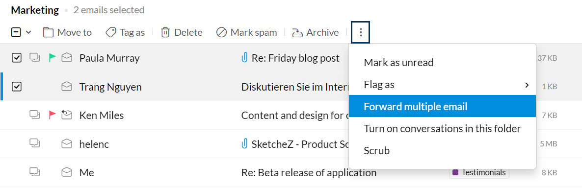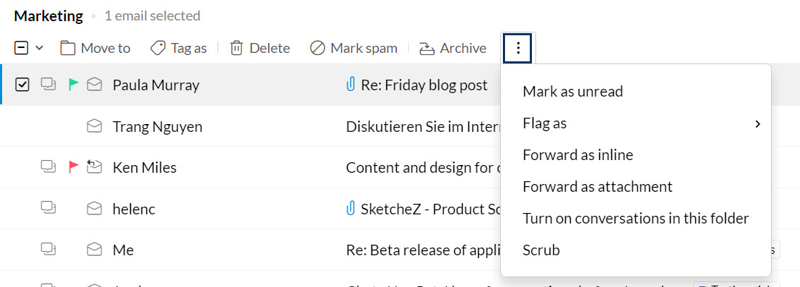 Further, actions such as Mark as unread, Flag as, Forward as inline, Forward as attachment, Turn on/off conversation and Scrub can be performed on the selected emails from the More Actions menu.