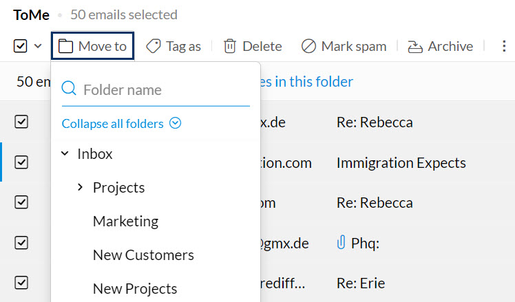 You can select single or multiple emails and move them to a folder of your choice directly from the email listing pane. Choose the Move to option in the menu bar, and select the required folder from the options listed. The selected emails will now be moved to the respective folder.