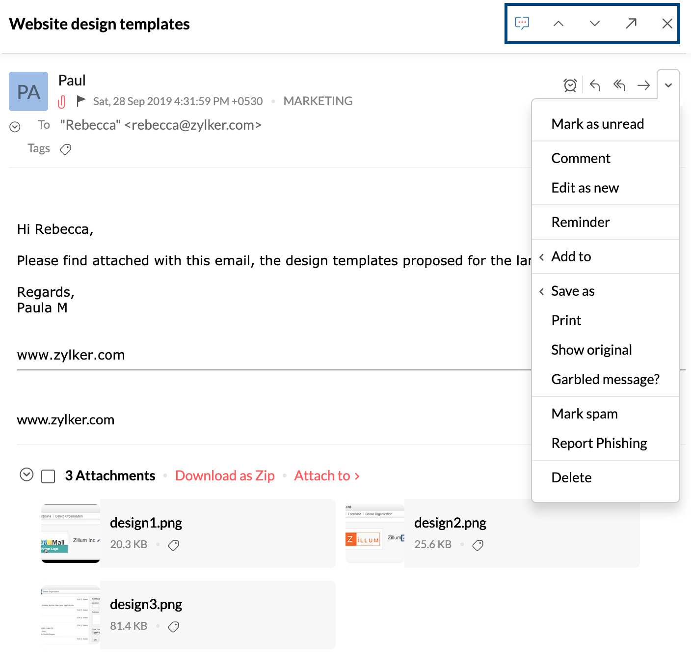 Zoho Mail also offers attachment based views that let you view the attachments in each folder, and the emails containing attachments. Refer this help page for instructions.