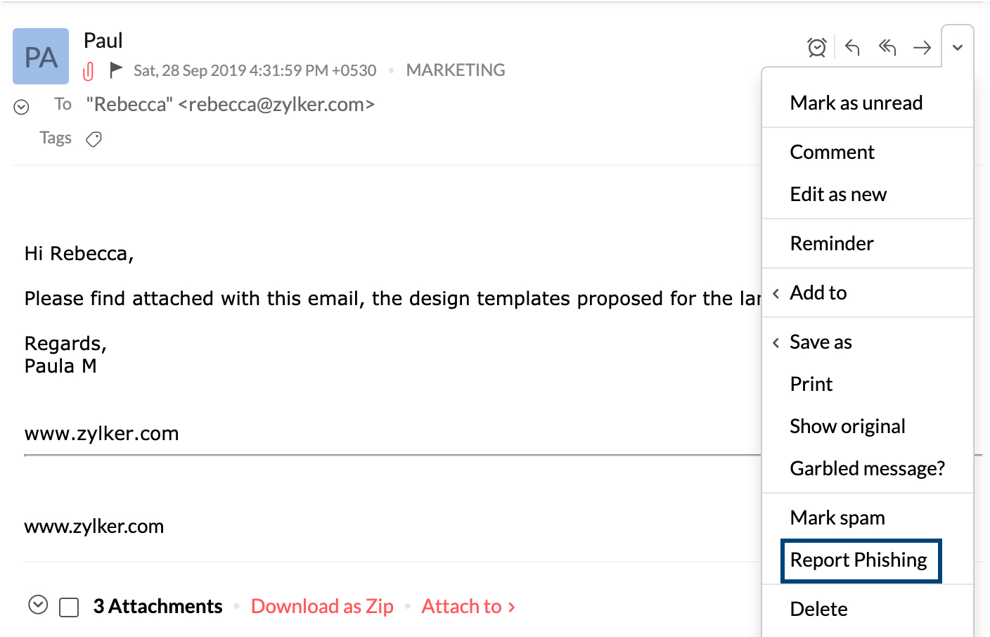 Phishing is an attempt at retrieving important personal information through emails by pretending to be from reputed companies. You can mark an email as a phishing attempt by using the Report Phishing option in the More options drop-down in the mail preview.