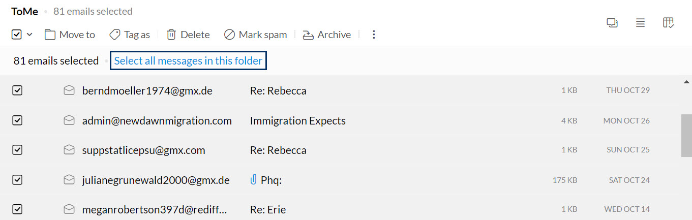If you want to move all the emails in a specific folder to a different folder, you can make use of the Bulk Actions option. Click the email selection icon, and choose All from the listing. This will select only the emails that are currently displayed in the view. If you choose the Select all messages in this folder option, all messages in the folder will be listed.