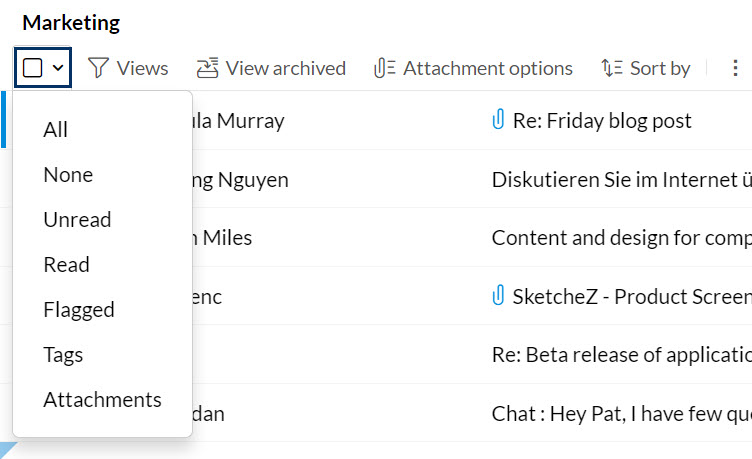 In certain cases, you might want to select a group of emails to perform a bulk action on them. For example, you might select emails with tags or flags associated with them and move them to a different folder. In such cases, you can make use of the group email selection option. To select a particular view, click the dropdown list next to the checkbox icon in the top left corner of each folder. This option lists several views. Select the required view and you'll further be able to perform any operations on these emails.